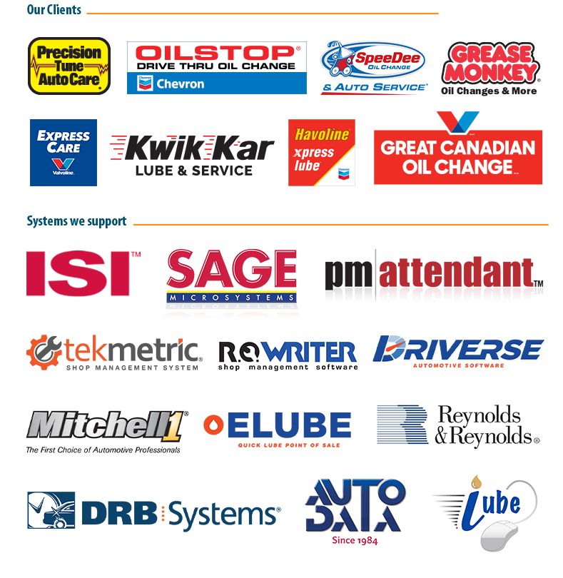 Precision Tune Auto Care Oilstop SpeeDee Oil Change & Auto Service Grease Monkey Oil Changes & More Valvoline Express Care Kwik Kar Lube & Service Havoline xpress lube Great Canadian Oil Change ISI SAGE PM Attendant TekMetric RO Writer Driverse Mitchell 1 eLube Reynolds & Reynolds DRB Systems Auto Data PCI-Lube